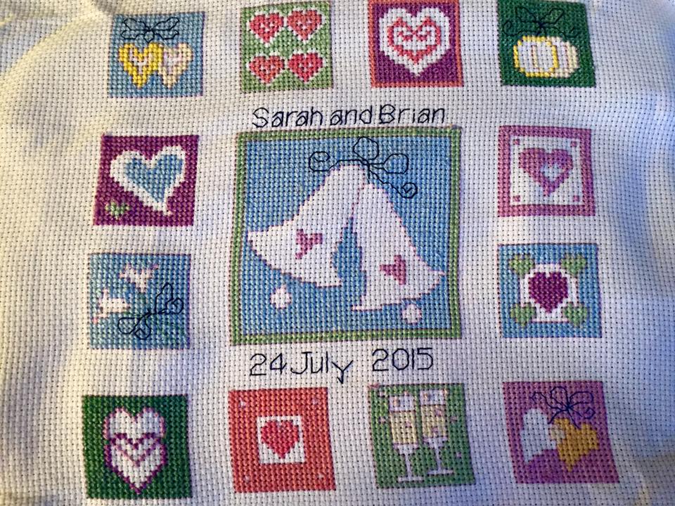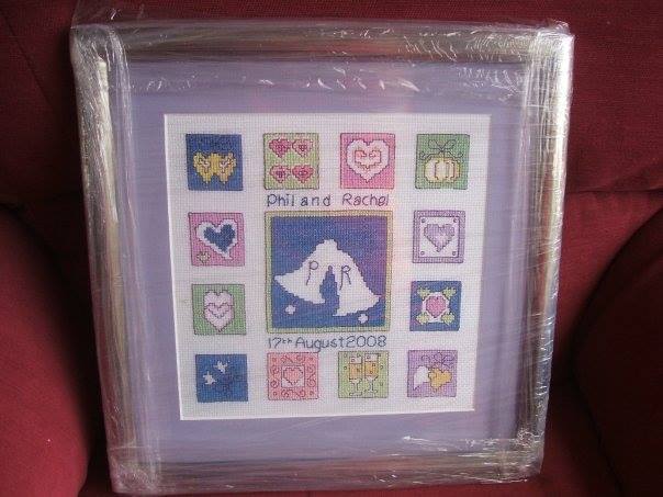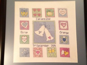 Another was for Chris and Karen, a girl from the office. It was the week before her wedding and I had it framed ready to be wrapped. It was only in a conversation I overheard she mentioned was marrying on the 4th. I had stitched 5th September. So again I had to carefully take the back off, unpick the weaving stitches and re-do the date. She never knew and I don’t think you can even tell.