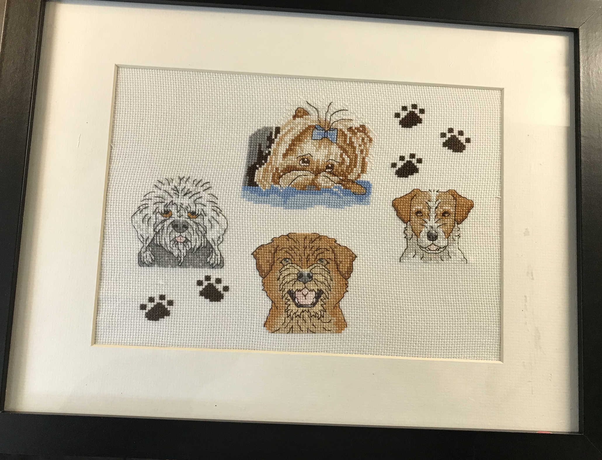My chosen subject was dogs, particularly because I have a Yorkie and had seen a lovely pattern I wanted to stitch. So I chose some other dogs to go with it, and stitched all the outline for the squares to match the number of people taking part.