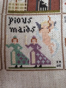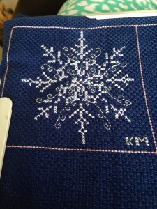 I stitched my own over the month, as did everyone else with third. Then we posted to the next person along with the accompanying chart, thread and fabric.