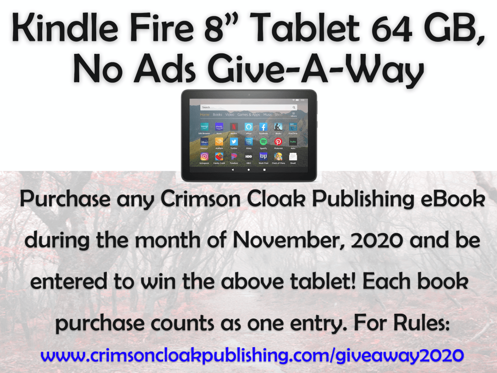 During the month of November 2020, my publisher Crimson Cloak Publishing is giving away this fantastic Kindle tablet.