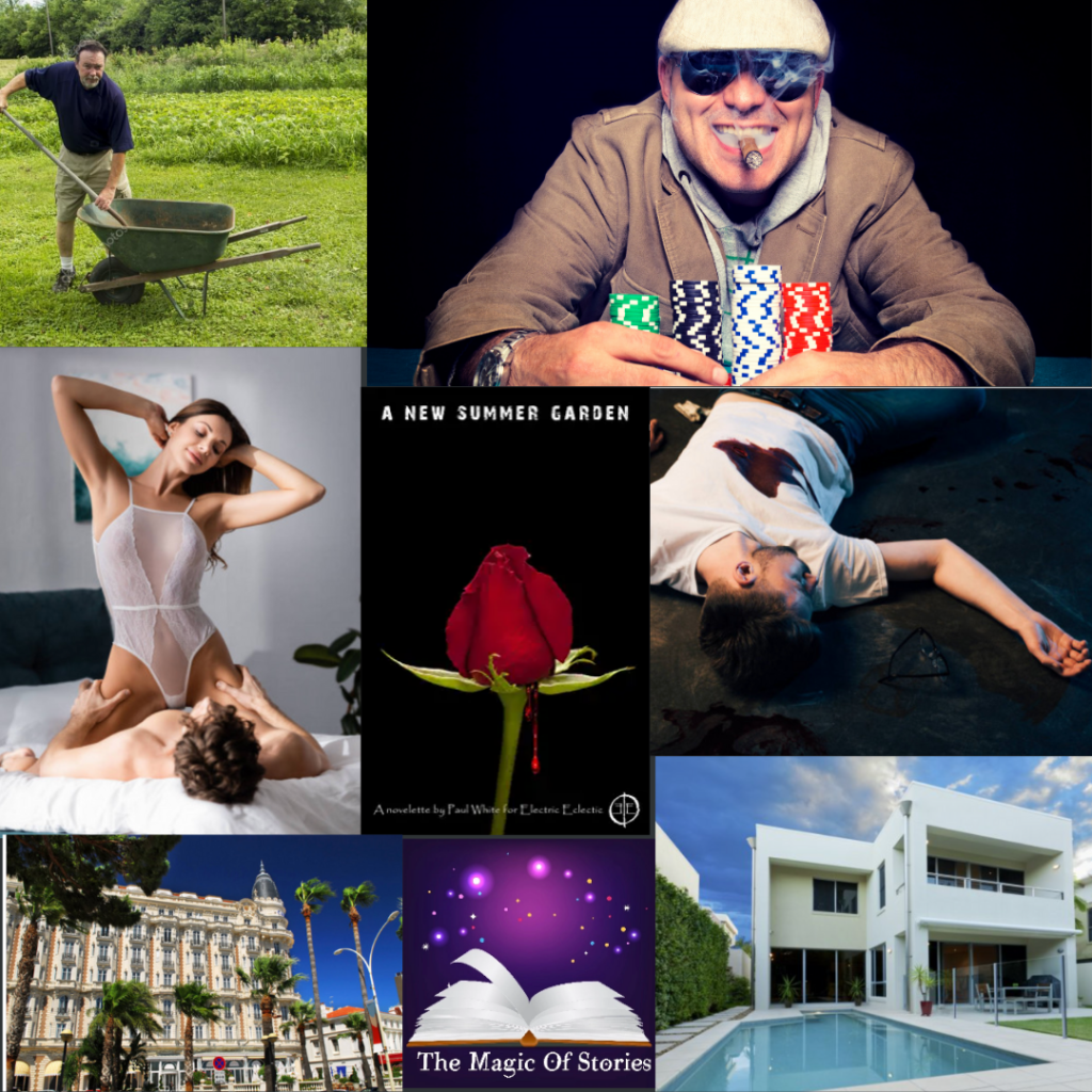 The first picture is Sam working in the garden of the house of Rachael and Peter. The second shows the card game that causes Sam so many problems. Rachael seduces Sam, and there is a murder. A fancy hotel where a story twist takes place, and the last picture represents the house where Sam can’t believe his luck.