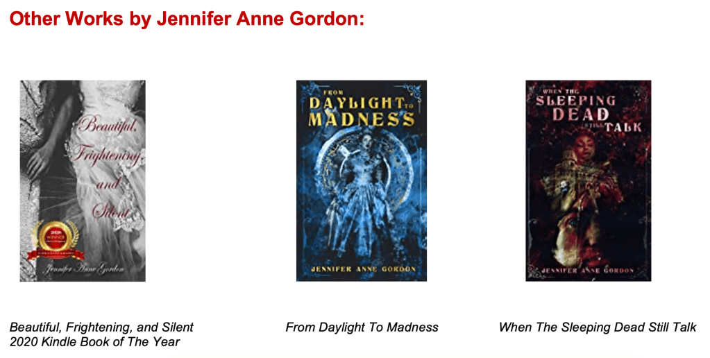 She lives in the wilds of New Hampshire with her partner on and off the dance floor. Her novels include the Kindle Award for Horror 2020 Winning book, Beautiful, Frightening, and Silent, as well as the historical Gothic novel From Daylight to Madness (The Hotel #1) as well as When The Sleeping Dead Still Talk (The Hotel #2). She had a collection of her mixed media artwork published during spring of 2020, entitled Victoriana: mixed media art of Jennifer Gordon.