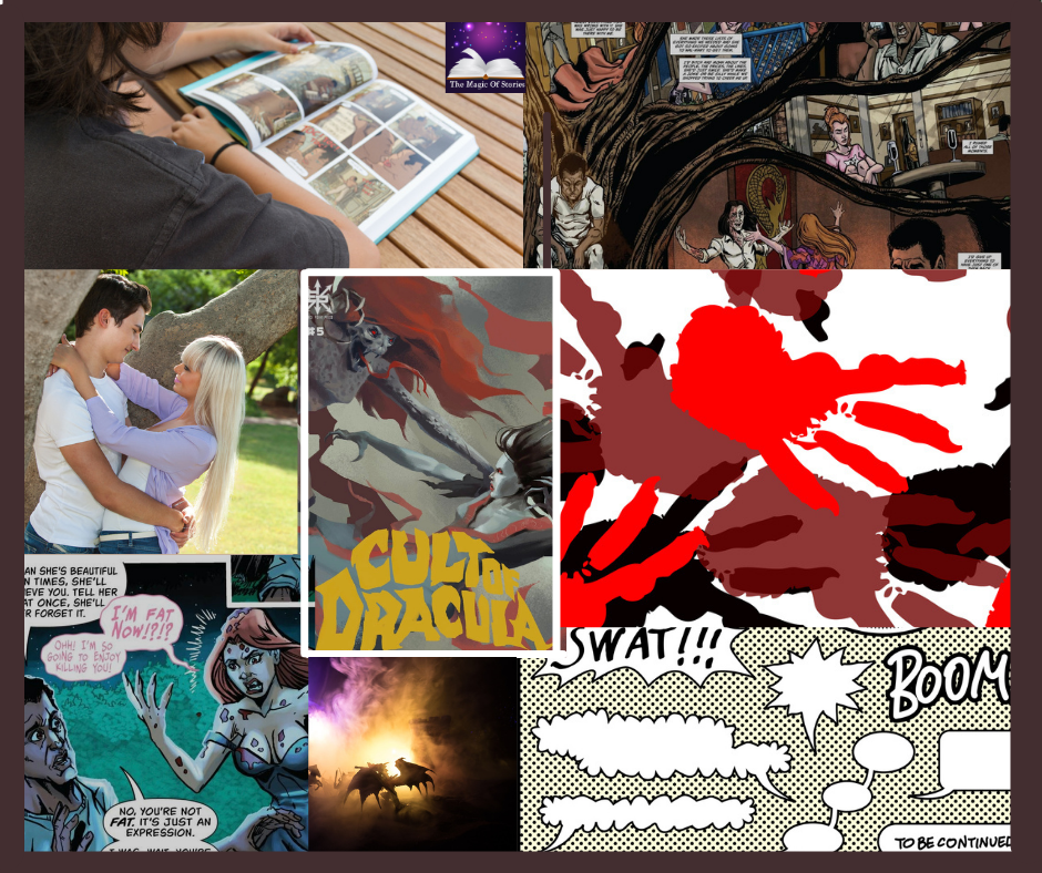 In the pictures telling stories I give you my interpretation of the book I’ve just read. In this case the 5th book in the series. Although I recognised one of the characters, the cult leader, I wasn’t able to determine the girls, Lucy and Mina. Although the later was named in one of the speech bubbles.