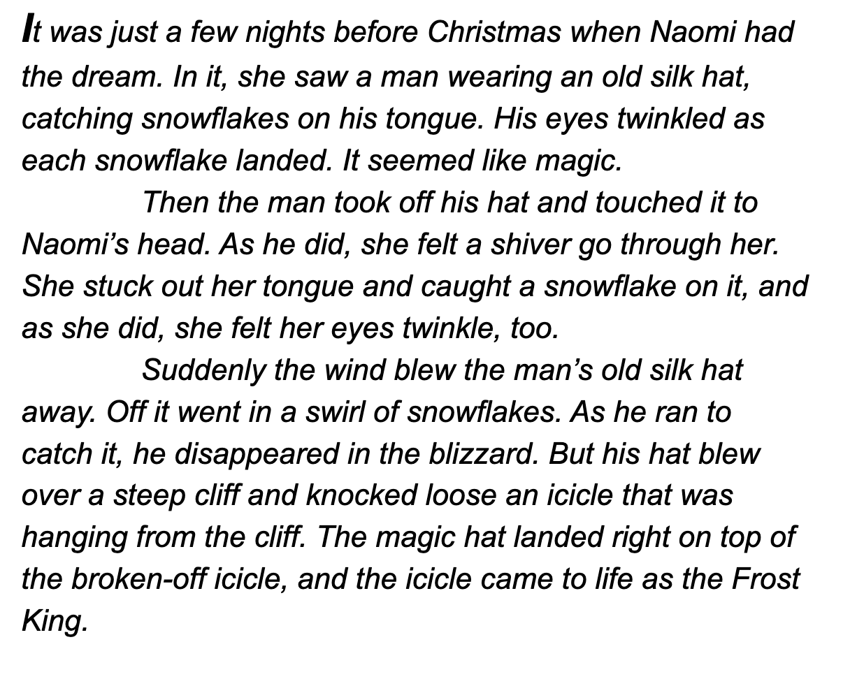 Once the Frost King reaches Santa’s cottage, everything Christmas is at a standstill, frozen in place. Naomi and her two new animal friends reached Santa, too, but can they save him and Christmas now or is it too late? Before she can stop him, the Frost King’s icicle hits Santa, and he stands like a statue, frozen in time.