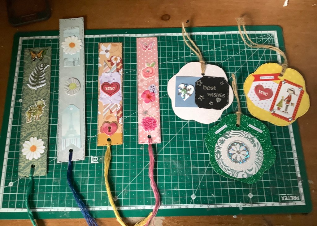 I found that I loved making gift tags, book marks, card embellishments, stitched mini books, and more. So I poured my love into making several items, and from my Facebook page I did a giveaway intending to randomly select one name. About six people entered and I had enough to send them all something. It was fun and I’ll probably do it again in the future.