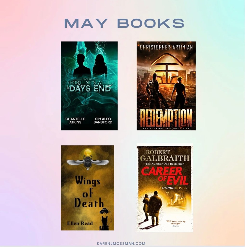 Another month where I’ve read continually. Days End is the third of a series, and Redemption, the fifth and Career of Evil, book three. It was also the largest book I’ve read this year at 607 pages. Wings of Death is an advanced reader copy, and due out in June.