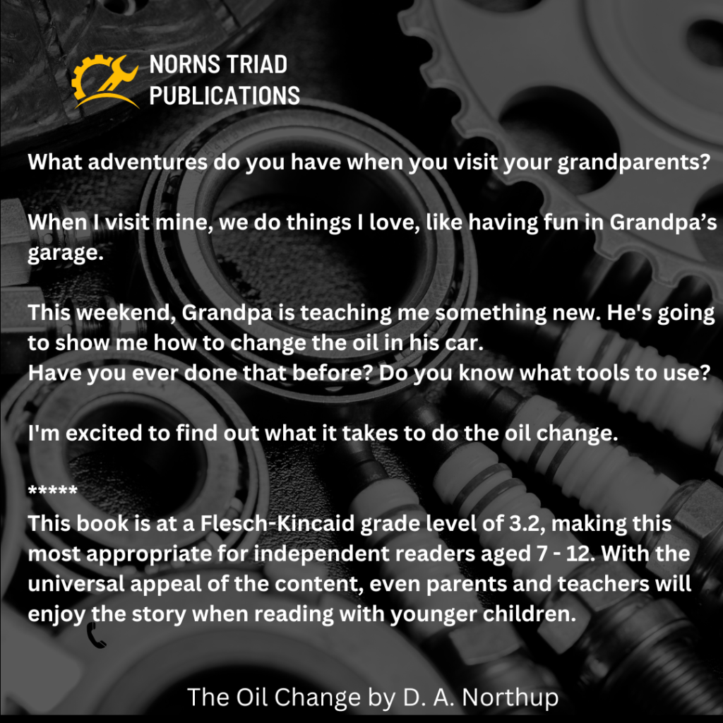 Overall: This a great story for children who want to make special memories with their grandparents. The book also has wonderful vivid illustrations that adds reference to the story. I would say the paperback is ideal for your child to to sit outside and read under a tree. I think they will come running in to ask if they can help the next time you change your oil! A perfect gift for your child.