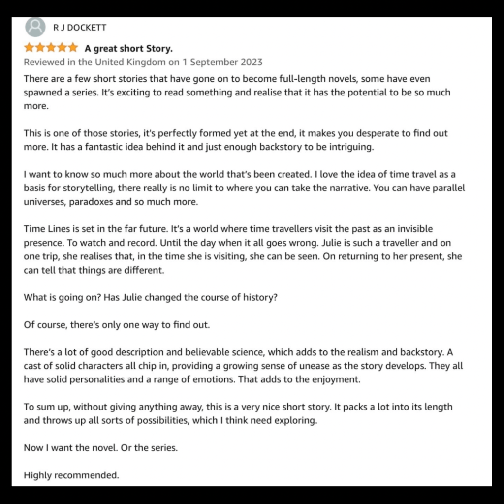 I’ve been thrilled with the reviews I’ve received for Time Lines. Having never written Science Fiction, this was totally different for me. Not my favourite topic for a book, but I like to try my hand at different genres and this was definitely a success.