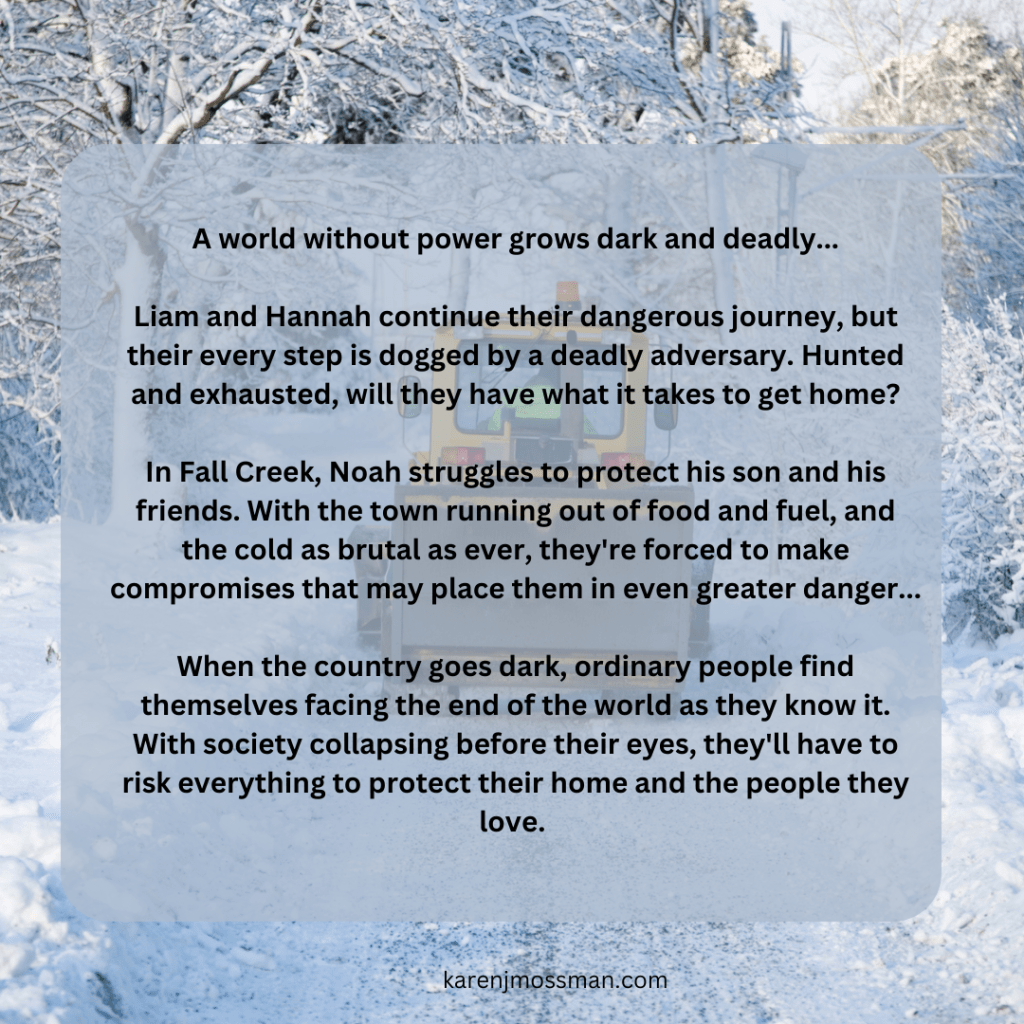 The other set is Hannah’s husband, Noah, and their son, Milo. They are already in Falls Creek and things are equally as bad. The sheer cold is killing people, and food is running short. Noah, who is a police officer becomes embroiled in situations that make him more and more uneasy.