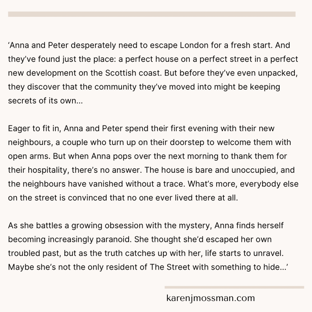 Anna is the main character and she moves into a gated community street with her husband Peter, which was supposed to be their safe haven. Right from the start it’s obvious something is wrong with her neighbours and the street itself.