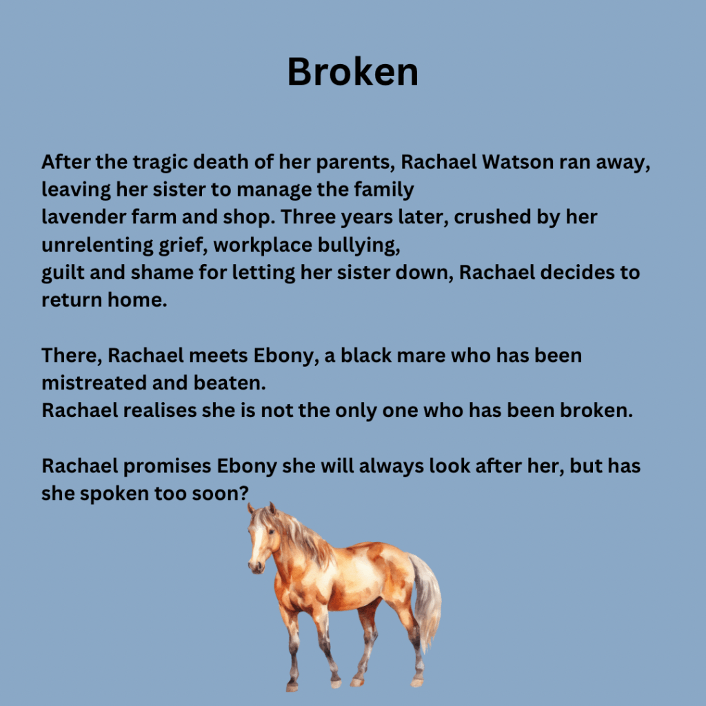 Broken is a contemporary story that involves families, intrigue, and a beautiful horse. Being a horse lover, this is easily my favourite of the two. Rachael finds peace and also a beautiful horse and maybe, they can help each other.