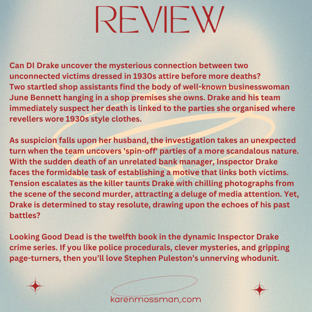 Inspector Drake and his team of now familiar detectives are faced with a murder when a a women is found hanging in her shop. She is the owner of Looking Good, hence the title. This is followed by further murders.